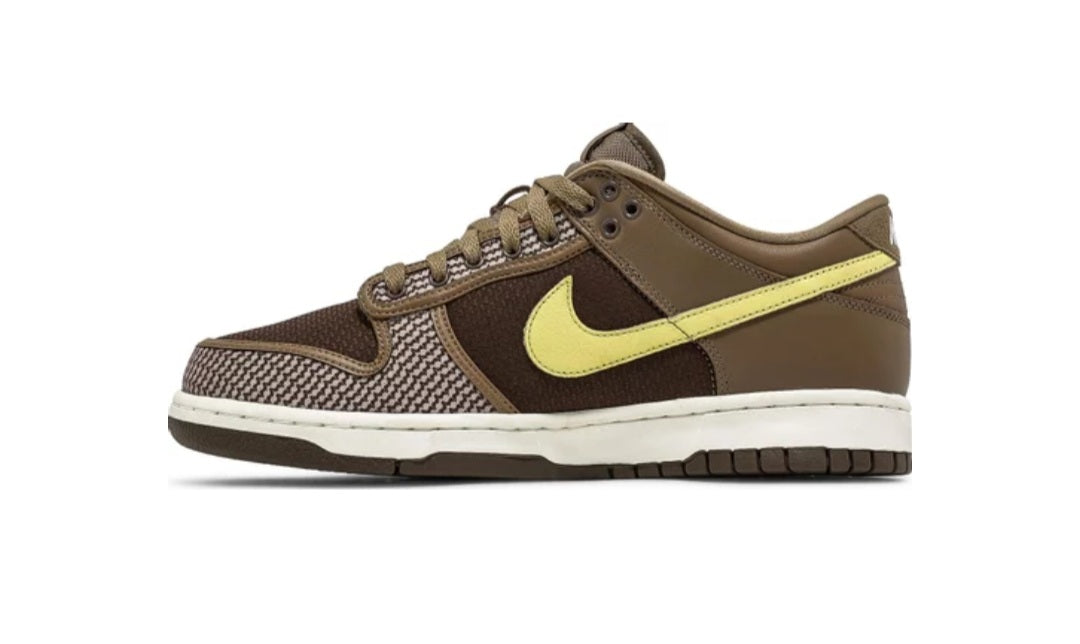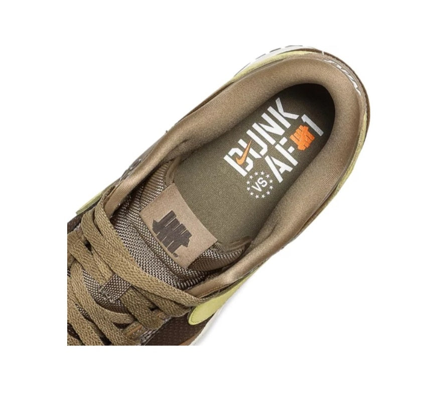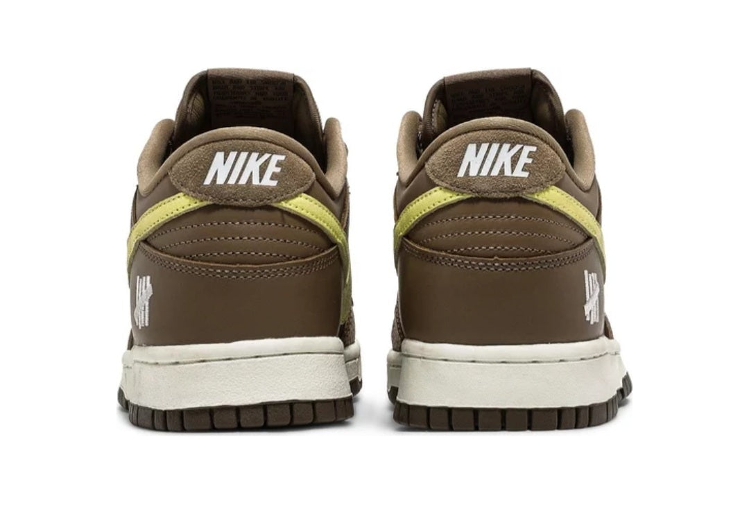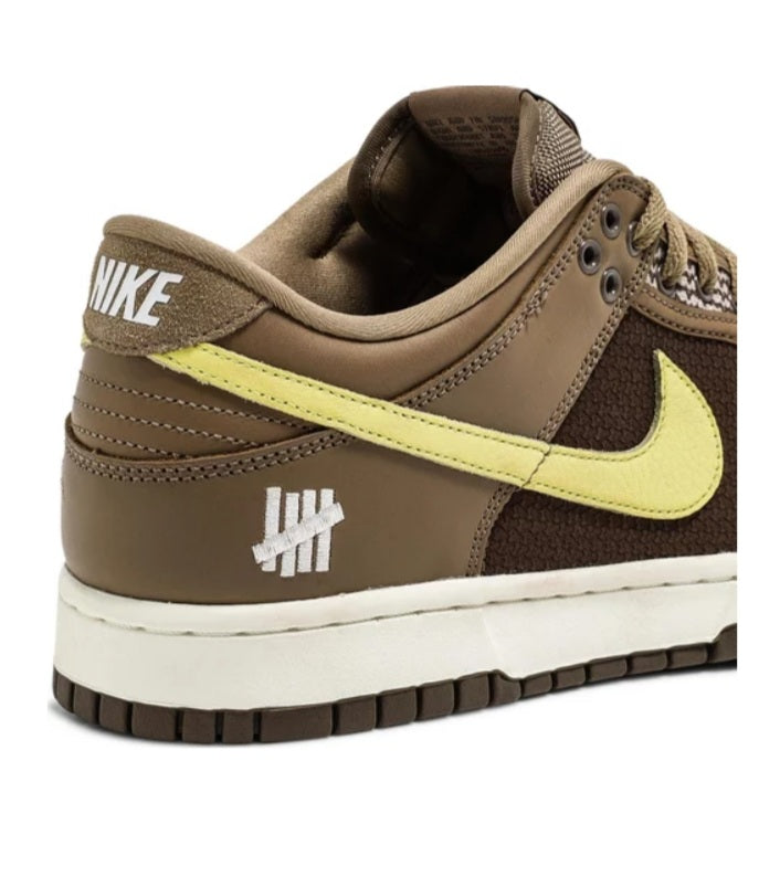The Nike Dunk Low SP UNDEFEATED Canteen features a Canteen canvas and leather upper with a Palomino canvas toe wrap and eyestay. Lemon Frost leather Swooshes and UNDEFEATED tally mark insignias on the tongue, heel tab, and lateral heel complete the design.
